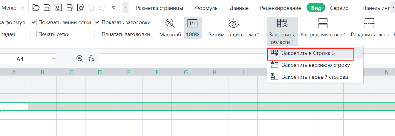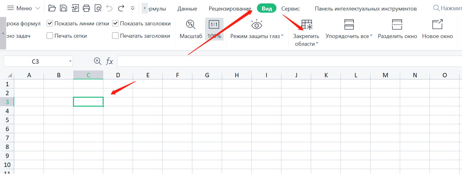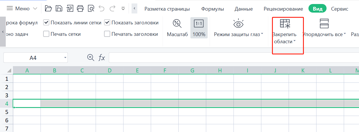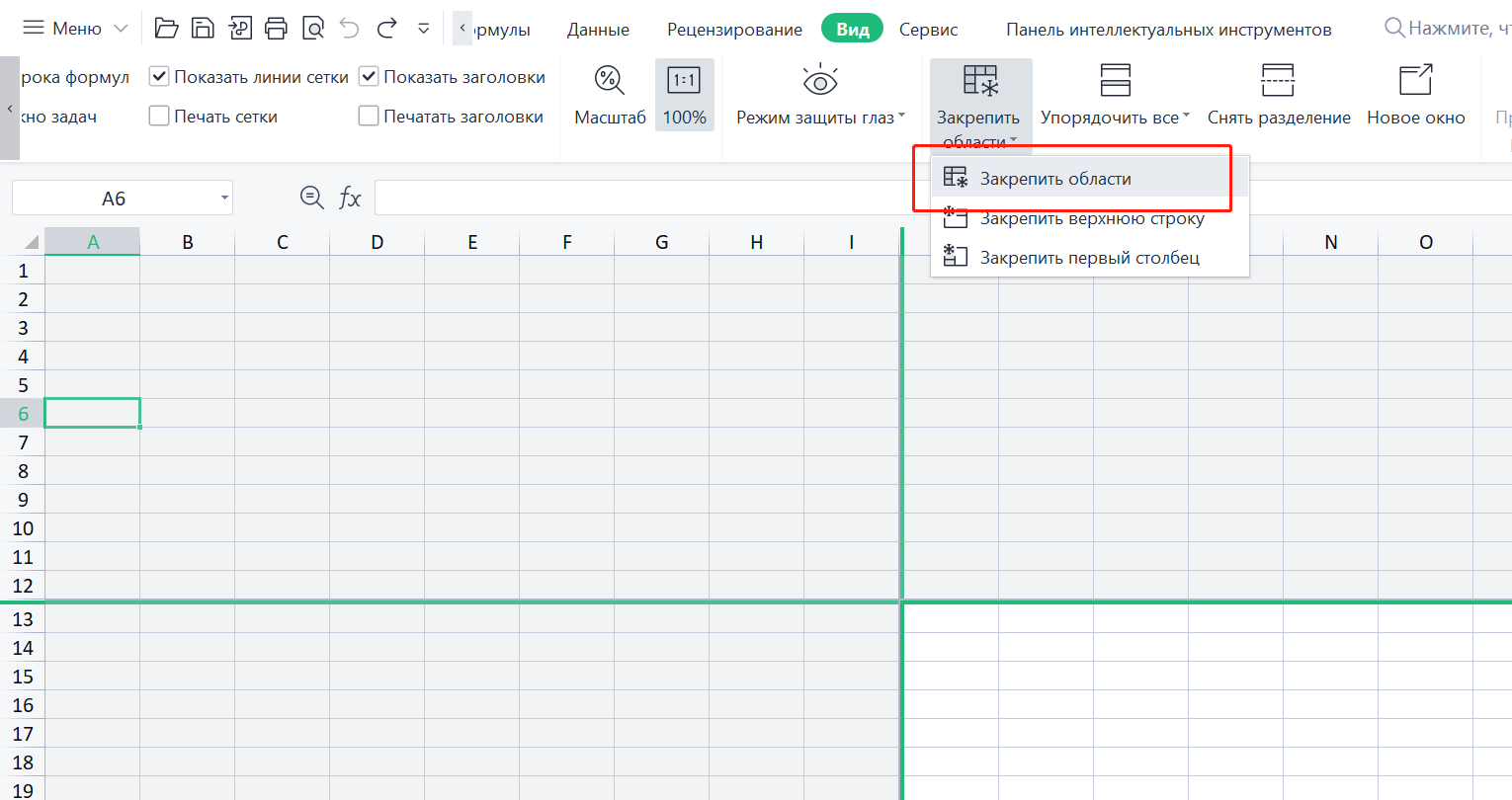 2. На вкладке "Вид" нажмите на выпадающее меню "Закрепить области".