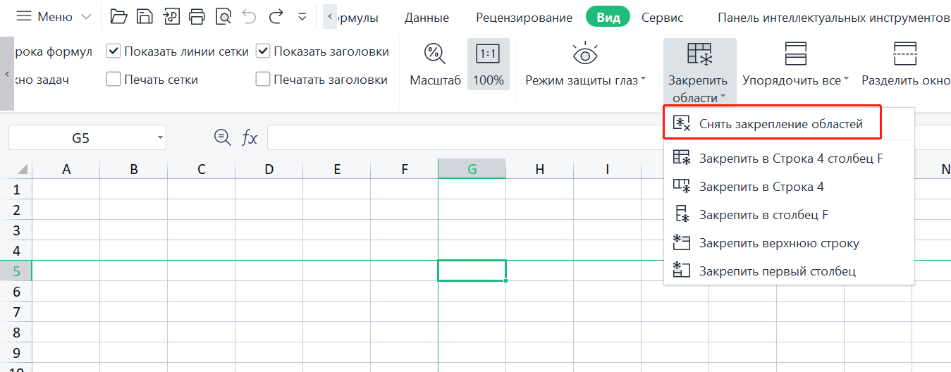Чтобы разблокировать строки или столбцы, которые были заморожены в Excel, выполните следующие шаги: