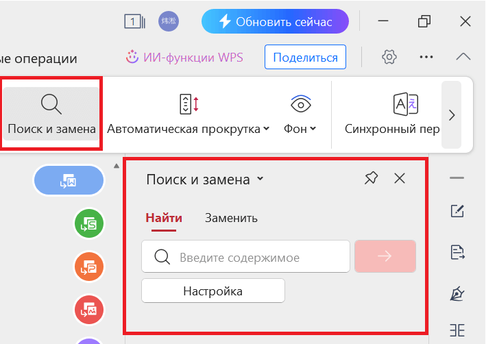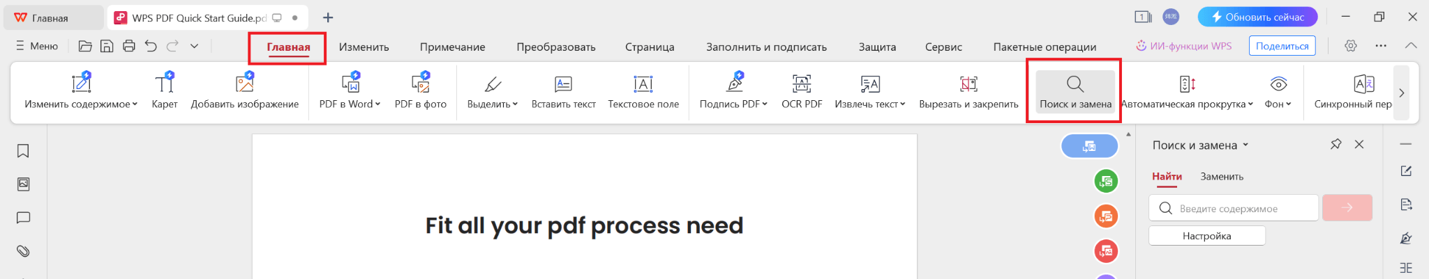 Шаг 1: Инструмент "Поиск и замена" доступен на ленте "Главная". Нажмите на него, чтобы открыть окно "Поиск и замена" на правой стороне интерфейса WPS PDF.