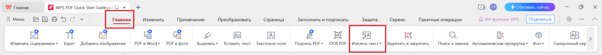 Шаг 1: Чтобы извлечь текст из PDF, перейдите на вкладку "Главная" и выберите опцию "Извлечь текст" на ленте.