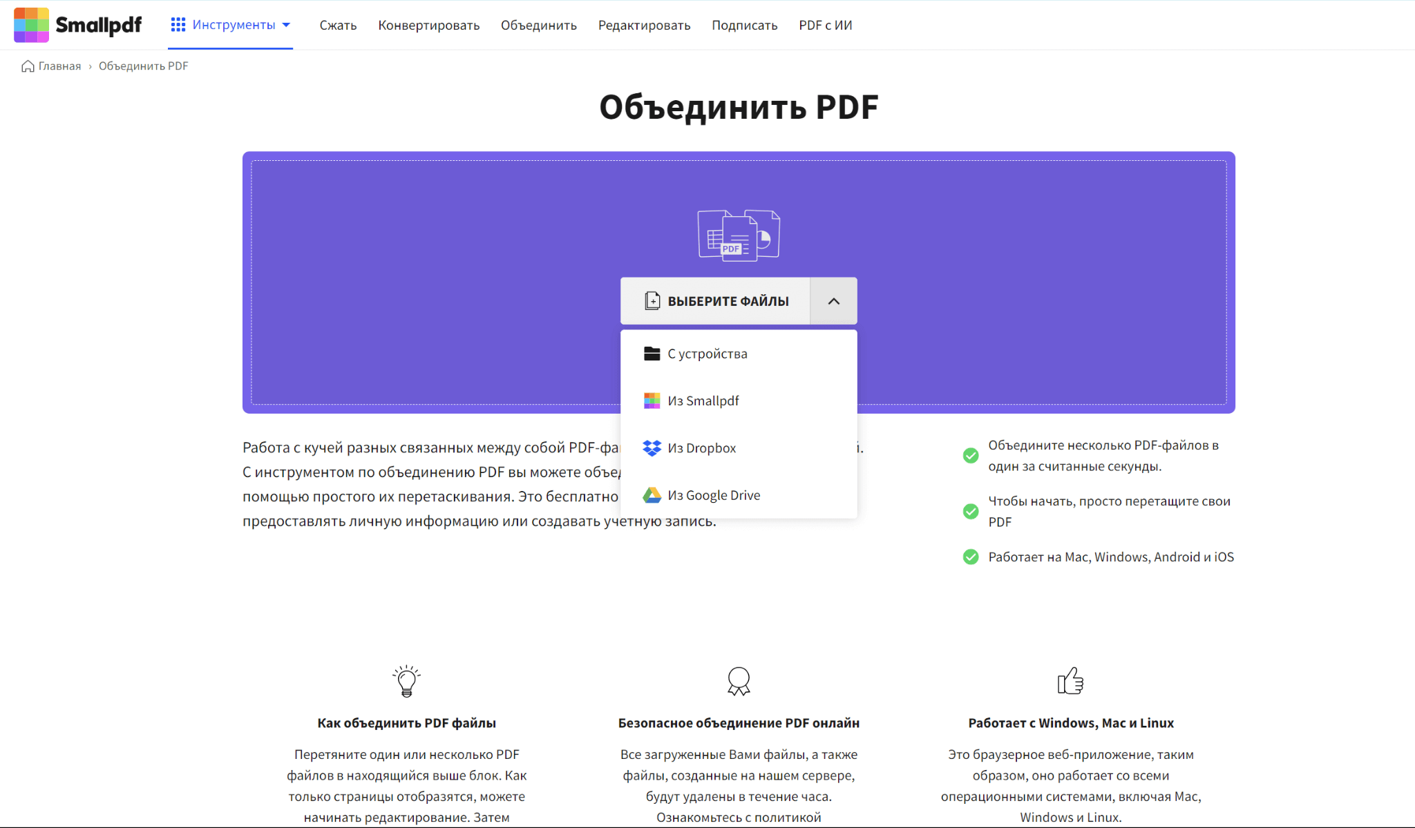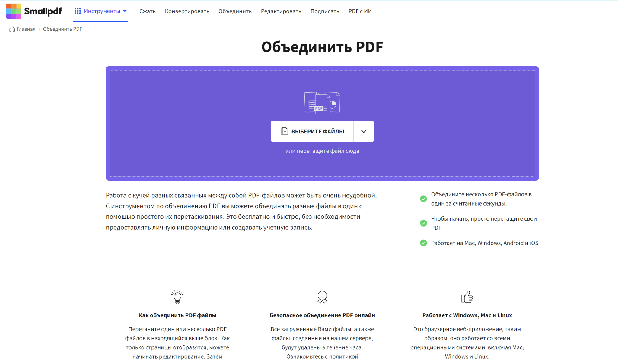 Простой инструмент для объединения PDF-файлов: Пользователи могут легко объединять их за считанные минуты без регистрации на платформе.