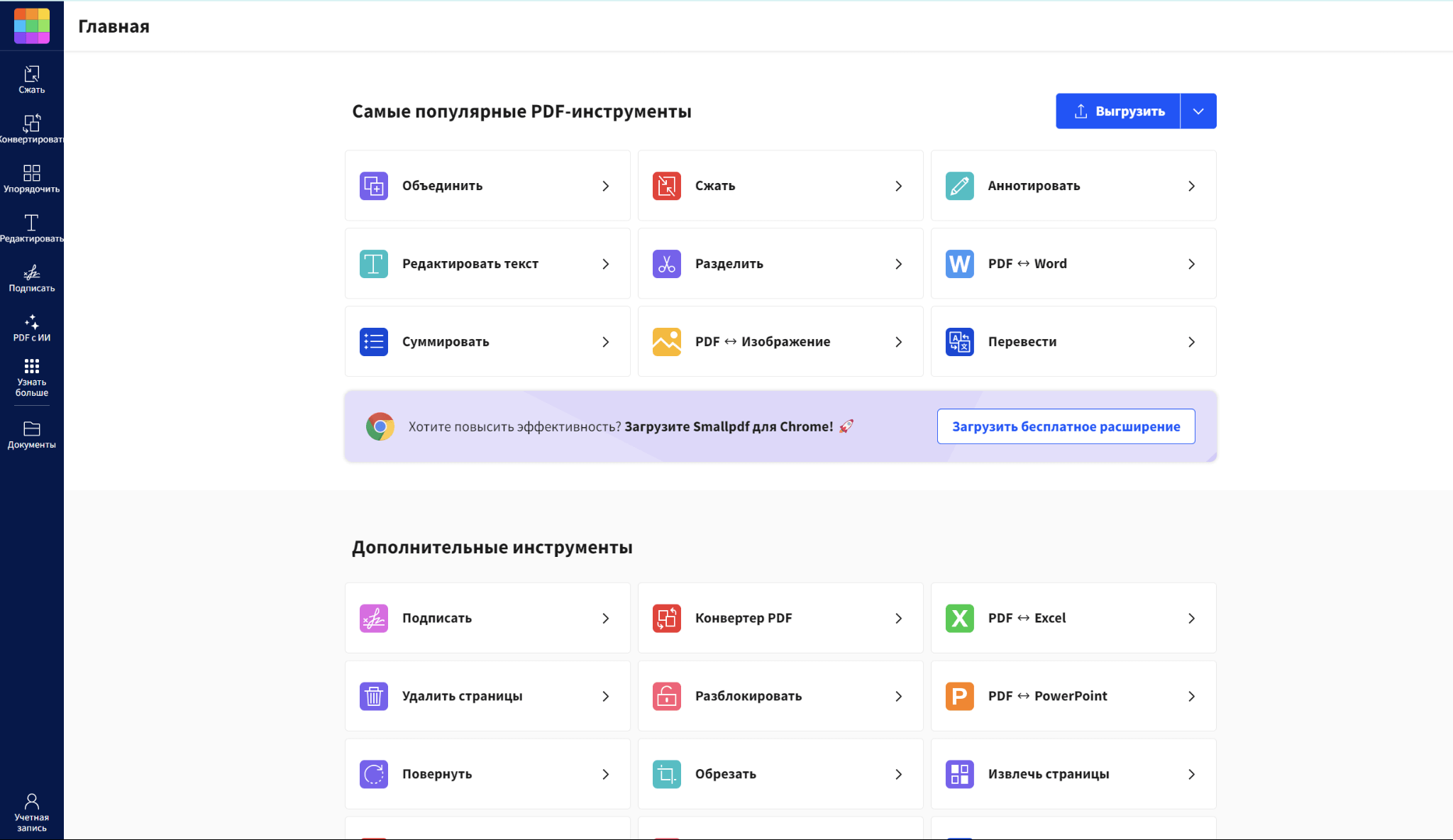Smallpdf имеет интуитивно понятный и современный интерфейс, но не предлагает пользователям функции настройки. Новые пользователи могут испытывать трудности с навигацией по платформе. Однако с частым использованием становится легче ориентироваться на платформе.