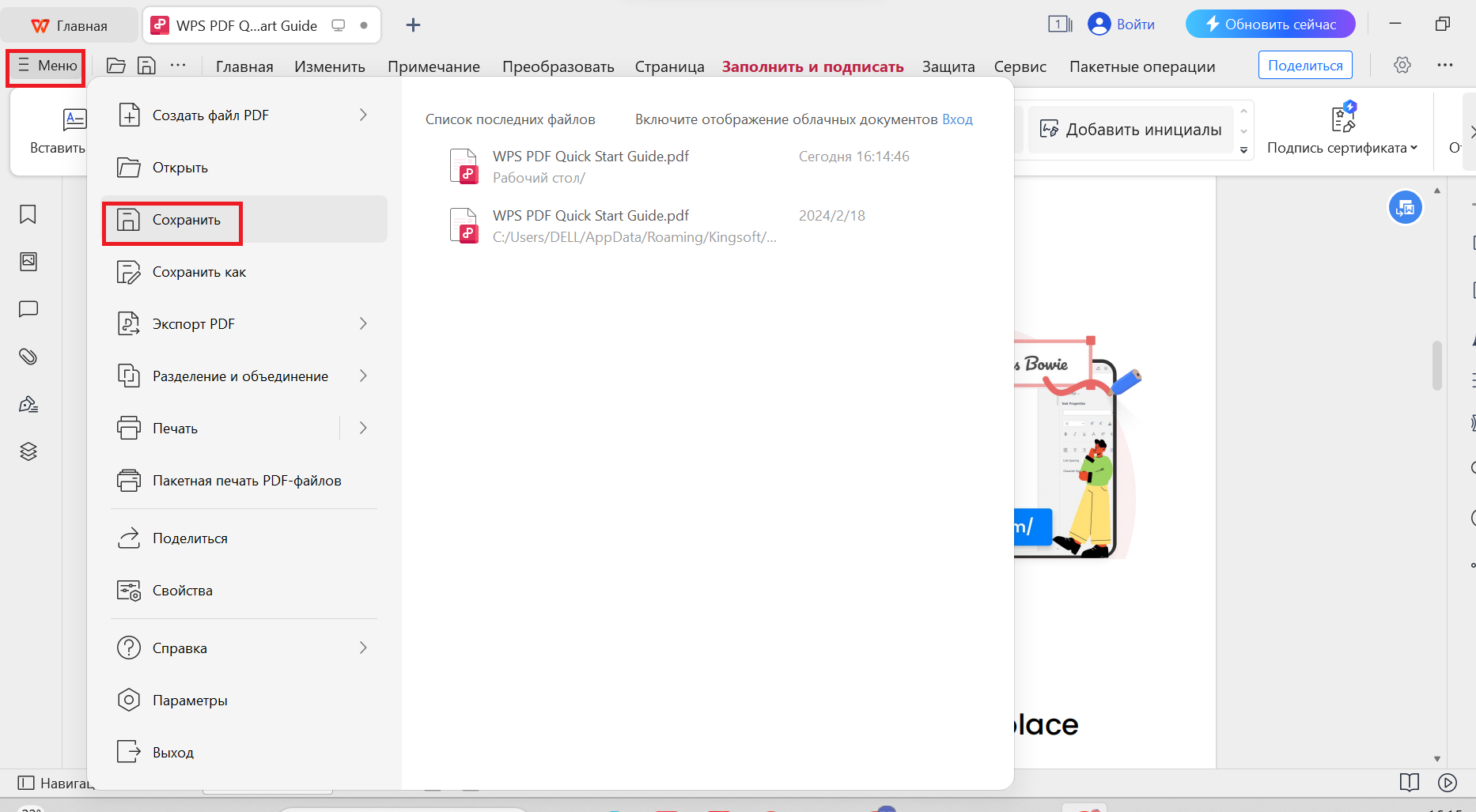 Шаг 4: Чтобы сохранить свои идеи в безопасности, нажмите на кнопку "Меню" на вашем PDF. Затем найдите кнопку "Сохранить" и выберите ее.