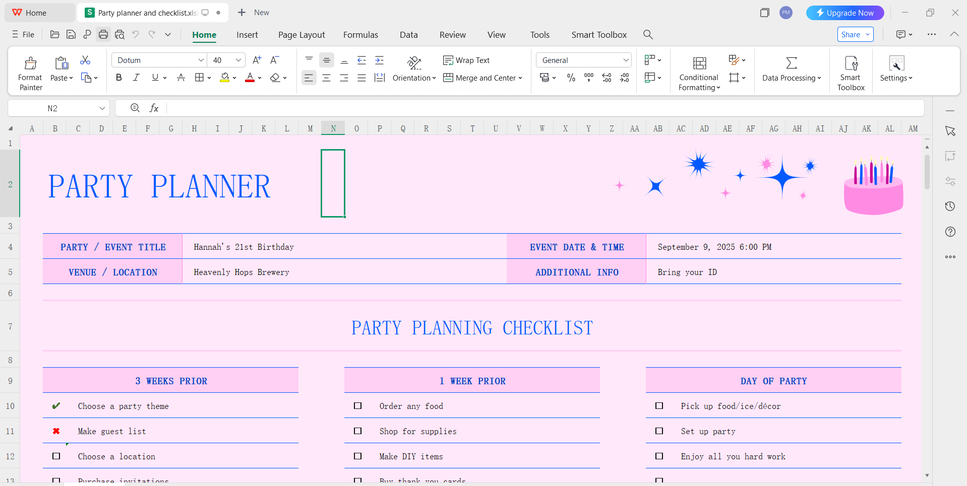 Этот шаблон для планирования дня рождения также служит универсальным органайзером мероприятий, со встроенными временными шкалами задач и отслеживанием расходов.
