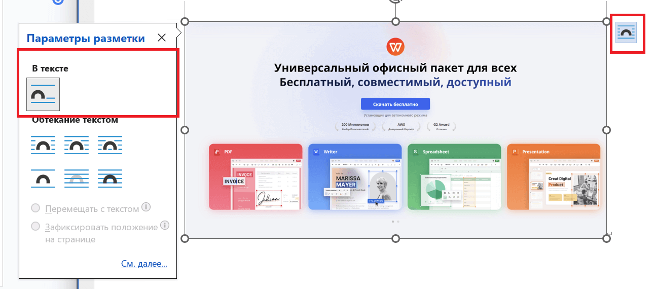 Второй метод включает удаление якоря из документа Word полностью, изменив макет изображения:
