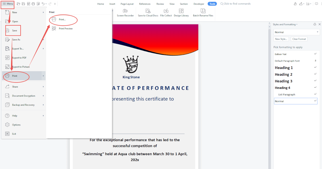 Шаг 2: Выберите «Сохранить», затем перейдите к «Печать» вашего шаблона word/pdf/ppt.